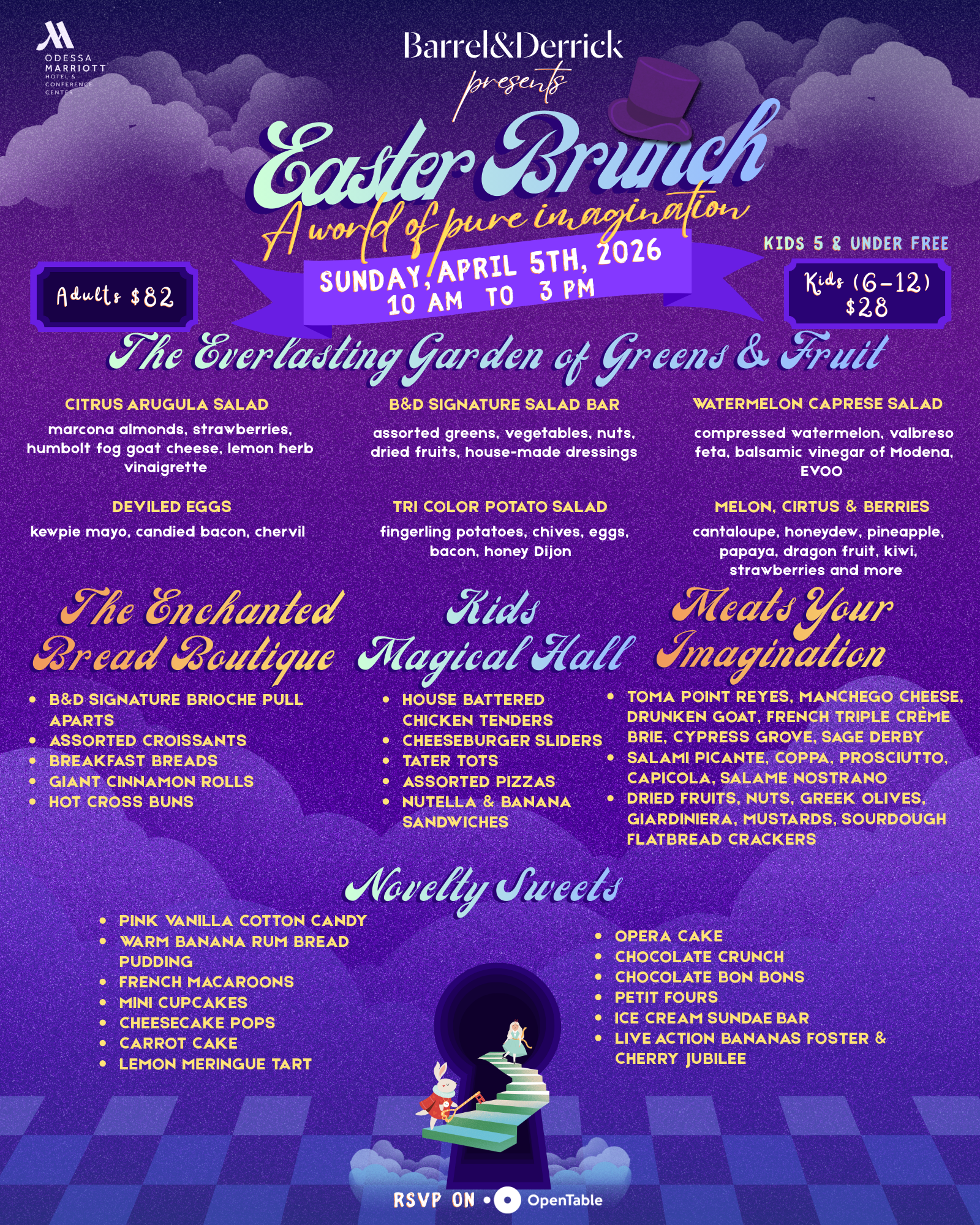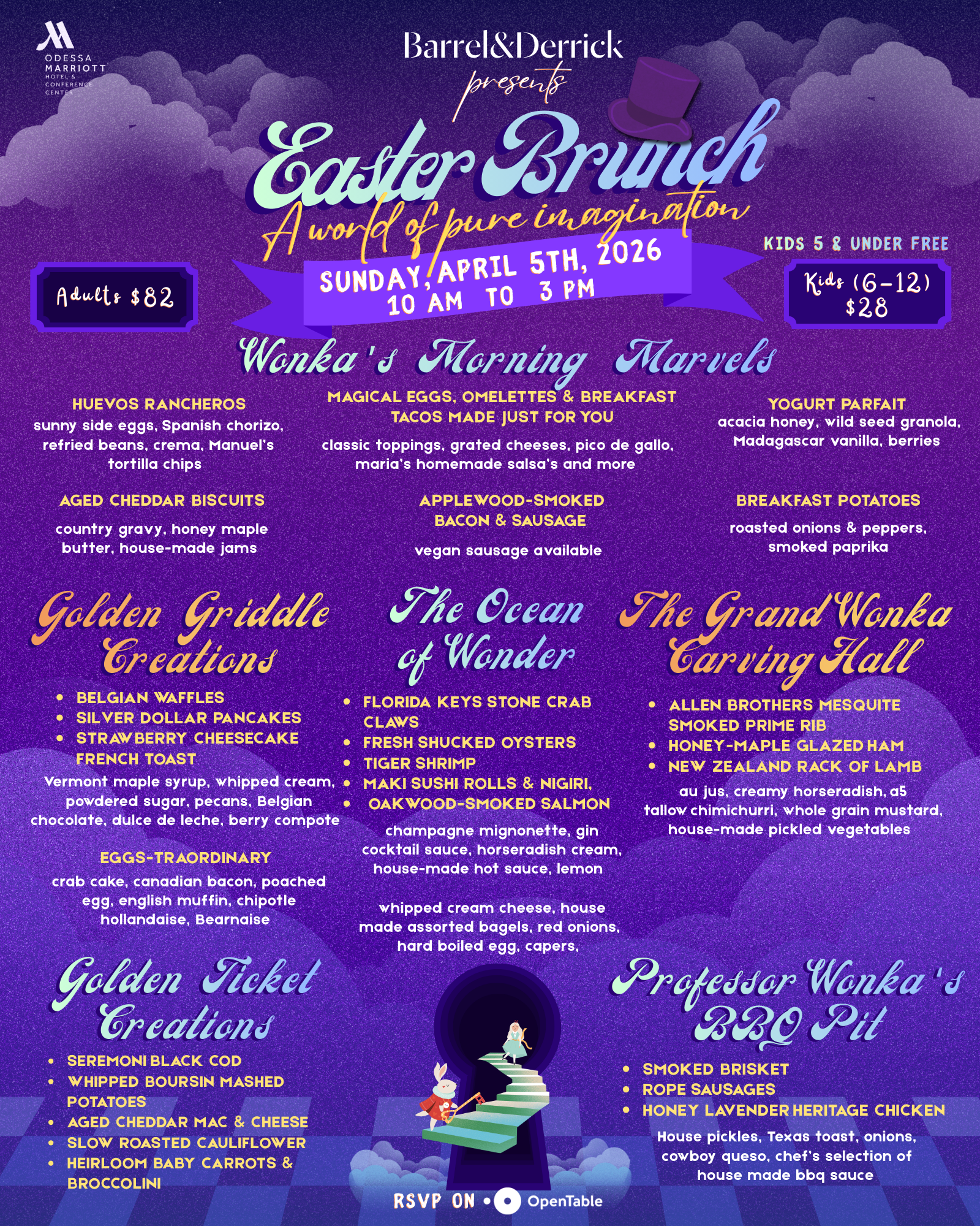 Gather the whole family and join us at Barrel & Derrick for a welcoming, one-of-a-kind Easter brunch alongside the Easter Bunny, Alice in Wonderland, and Willy Wonka. The chef-curated menu, crafted by our acclaimed Executive Chef Rakeem, is designed to delight every member of the family.